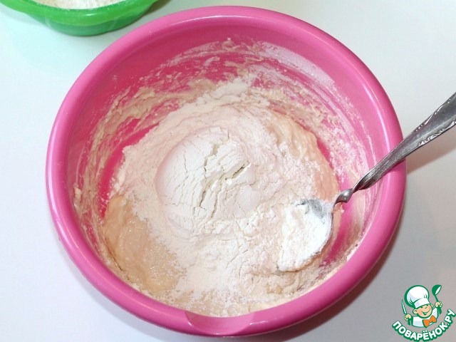 4. Добавить частями просеянную муку и замесить мягкое, не липнущее к рукам тесто. У меня ушло ровно 310 граммов муки.