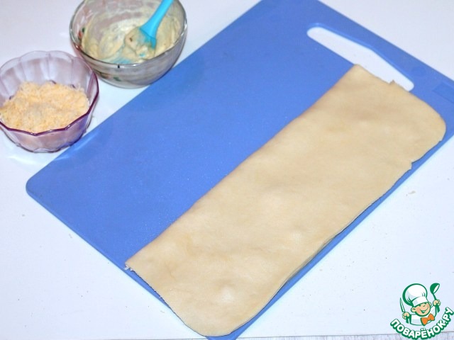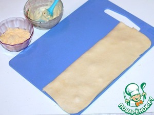 10 Смазываем прямоугольники теста растопленным сливочным маслом и посыпаем сыром.