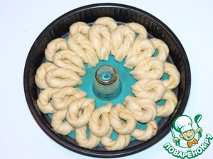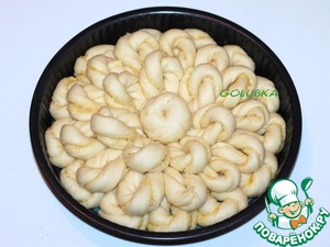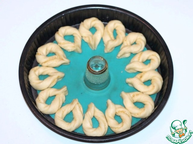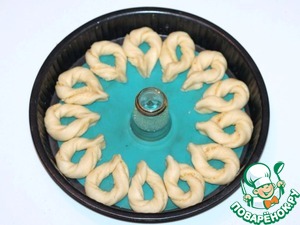 14. Берем форму (Ф 22-23 см) для выпечки. Кладем на дно силиконовый коврик (не смазываем маслом) или пищевую бумагу (смазываем маслом). Выкладываем заготовки по краю формы.