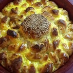 18. Переводим температуру духовки на 190 С. Достаем пирог и смазываем взбитым со сметаной желтком. Серединку можно посыпать кунжутом или тмином.