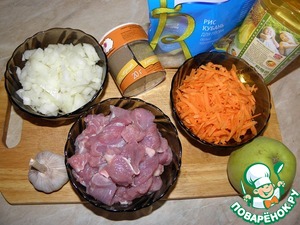Рис, если требует мытья-промыть и дать хорошо высохнуть (рис выбирайте нормальный) морковь лучше всего порезать тонкими брусочками, лук четверть кольцами (у меня мама решила помочь и сделала заготовки чуть по своему) Мясо режем удобными кубиками