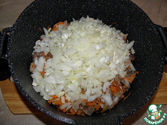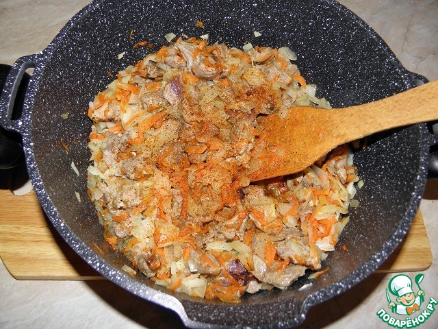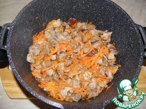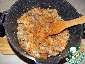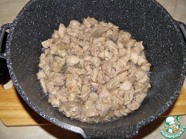 Мясо не надо сильно мешать, дать ему прожариться, а влага и сок должны практически выкипеть. Масло и вытопленный жир должны стать прозрачными, (минут 15 готовить)