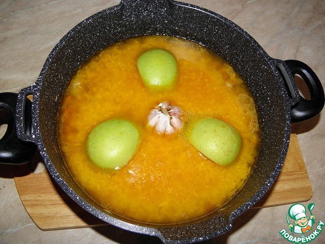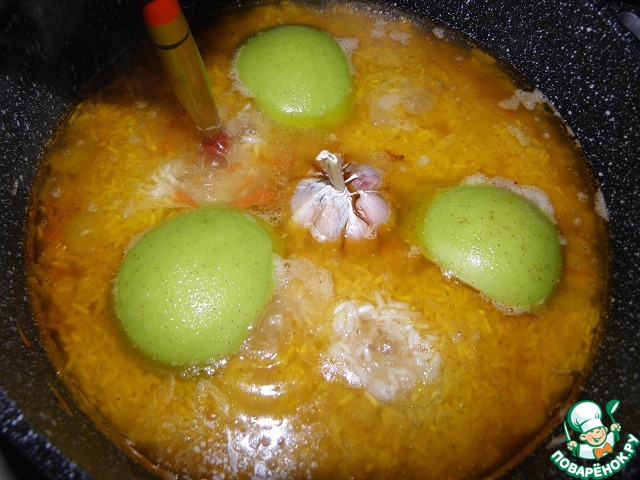 Яблоки не чистим, просто разрезаем на 4 части и убираем середину с семечками, выкладываем на рис, как бы немного вдавливаем их лопаткой. Чеснок целая головка, (не мыть, а слегка очистить), тоже вдавливаем в глубь середины
