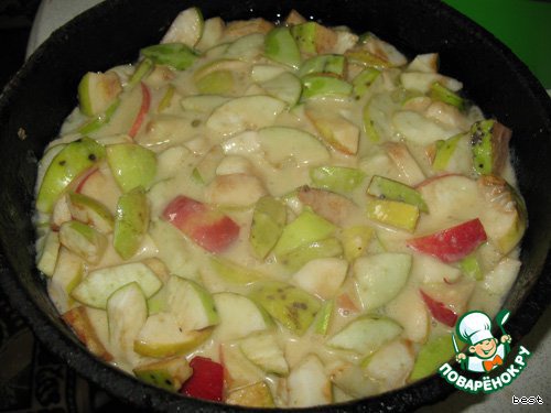 • Все ингредиенты для теста взбить до получения жидкого теста и вылить его на яблоки. Разровнять и запекать 40-45 минут, до золотой корочки.