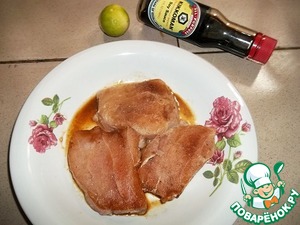 У меня кусок толстой части тунца, который я нарезала на 3 стейка толщиной 2см. Из одного лайма выжать сок. Рыбу натереть специями, полить соком и соевым соусом. Оставить мариноваться на час, иногда переворачивая.
