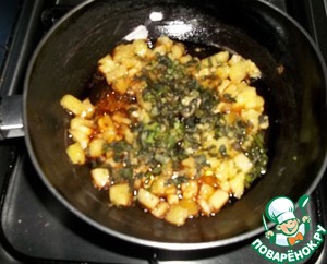 Ананасовый чатни готовить на среднем огне, помешивая. Сковороду вымыть, снова разогреть 1ст. л. оливкового масла, обжарить ананас 2 минуты, добавить соевый соус и зелень (оставить немного зелени и цедры лайма для подачи). Тушить минуту.