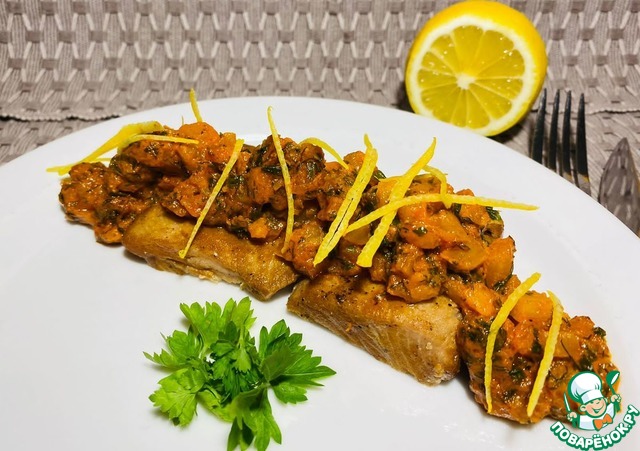 Добавить томатную пасту, острый перец, щепотку цедры лайма, жарить еще минуты 3-4, чтобы томатная паста поджарилась. Добавить сахар, смесь перцев, влить сливки и сок лайма. Соль я не добавляла, ориентируйтесь на Ваш вкус. Готовить пару минут, выключить огонь. На тарелку выложить рыбу, сверху - ананасовый чатни, посыпать зеленью и цедрой лайма. В качестве гарнира хорошо подойдет овощное ризотто, Я подавала на закуску.