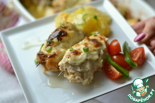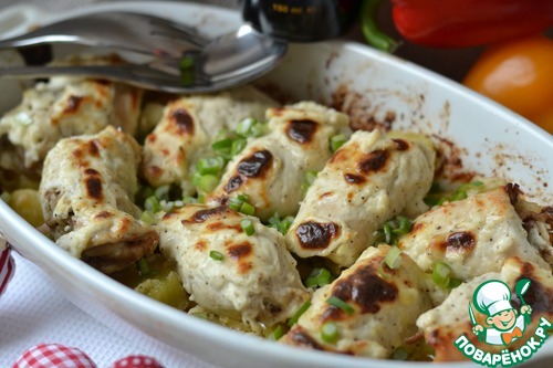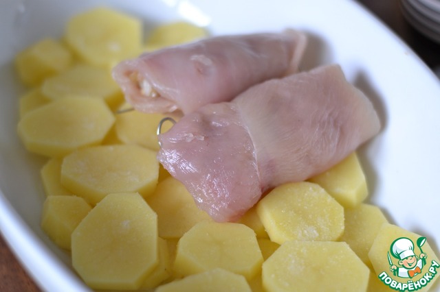 На картофель выкладываем куриные рулетики. -