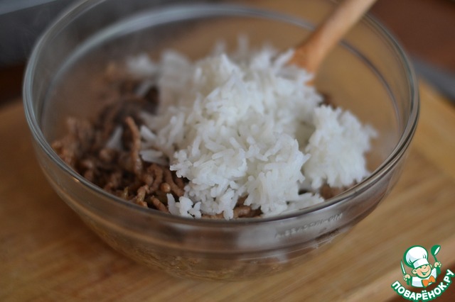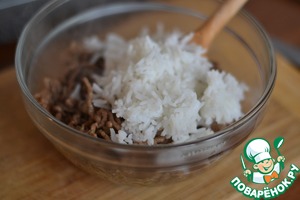 В отдельной миске смешать рис и обжаренное мясо.