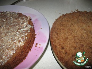 Корж разрезать на 2 части и промазать теплым сиропом.