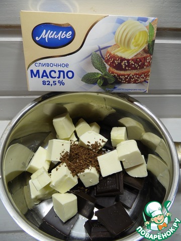 • Шоколад наломать небольшими кусочками, сливочное масло нарезать кубиками, добавить растворимый кофе. Растопить на водяной бане, остудить.