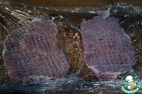 • Хорошенько (но стараясь не порвать!) отбить молоточком, предварительно накрыв пищевой пленкой.