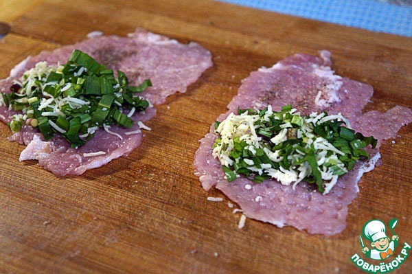 • Подготовить начинку. Сыр потереть на мелкой терке. Зелень мелко порубить, смешать с сыром. Вырезку или корейку порезать на пластины толщиной примерно 6-8 мм.