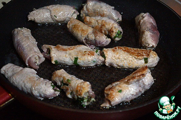 • В сковороде или сотейнике разогреть растительное масло, обжарить рулетики на сильном огне, укладывая в первую очередь швом вниз.
