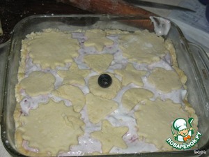 Из оставшегося теста вырезать выемками фигурки и выложить на начинку.