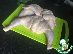 Для начала подготовим цыпленка. Я покупаю его уже в таком виде. Если у вас он не разделанный, то придайте цыпленку такую форму сами. Это не очень сложно. Сделайте надрез вдоль по середине грудки и распластайте цыпленка кожей верх.