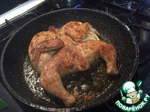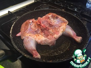 Разогреваем сковороду с растительным маслом и кладем туда нашего цыпленка кожей вниз.