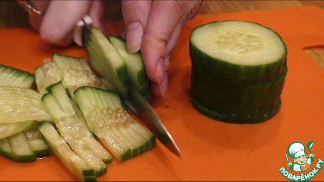 Порежьте соломкой или небольшими кубиками свежий огурец и ветчину.