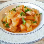 Добавить к мясу, перемешать, накрыть крышкой, тушить на медленном огне до готовности картофеля.