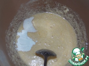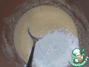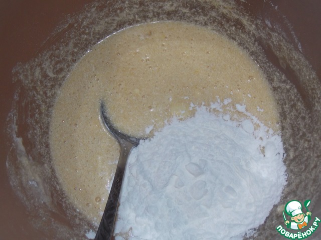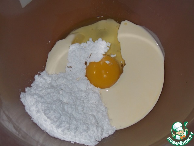 В чашку вбить яйцо, добавить растопленный маргарин, добавить сахарную пудру. Перемешать до однородности.