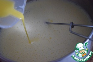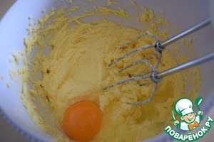Добавить по одному 3 яйца - после каждого добавления яиц, взбивать массу по пол минуты. -