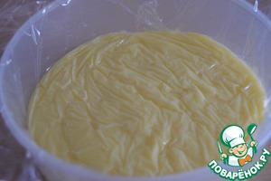 Готовый пудинг, ещё горячий, переливаем в подходящую ёмкость и накрываем пищевой плёнкой - чтобы плёнка полностью легла на поверхность пудинга.