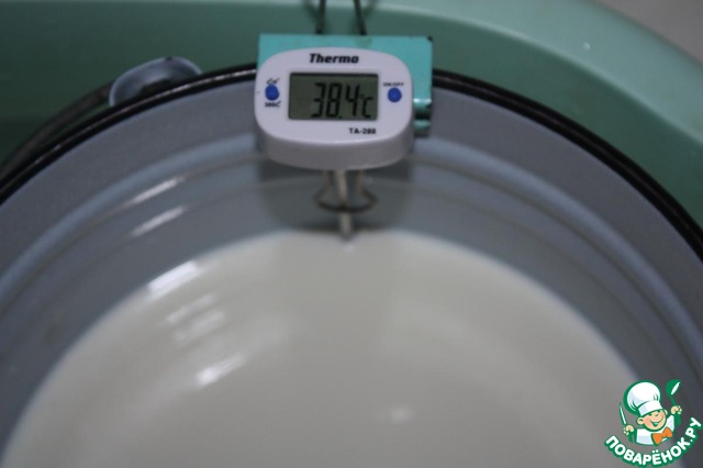 В молоко вносим закваску и хлористый кальций, разведенный в воде. Нагреваем до 38 градусов и оставляем при этой температуре на 30 минут. Вносим фермент. В ингредиентах не написал количество фермента, так как он может быть разным. Я использовал 0.05 г молокосвертывающего фермента Meito, растворенного в воде. Продолжайте поддерживать температуру 38 градусов.