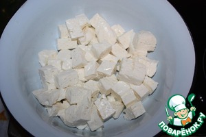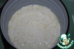 Через 45 минут образуется сгусток. Нарезать его на кубики. На этом этапе Вы можете регулировать плотность моцареллы. Чем плотнее Вы хотите получить моцареллу, тем мельче надо нарезать сгусток.
