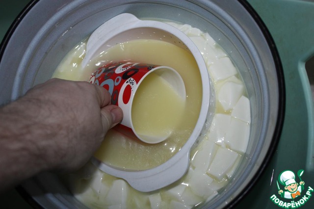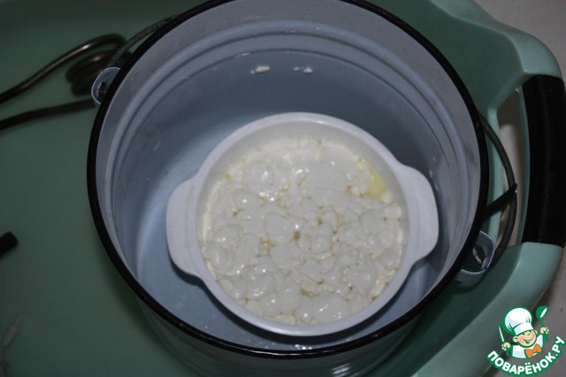 Для приготовления моцареллы на закваске Вам понадобится рабочая термофильная закваска. Я несколько раз пытался делать на сухих культурах, ничего у меня не выходило. Сырная масса не набирала нужную кислотность и не хотела тянуться. Приготовить термофильную закваску очень просто в йогуртнице. Готовить ее лучше всего на ультрапастеризованном нежирном молоке. Удобно заморозить в форме для льда. В замороженном виде закваска хранится довольно долго. Также заранее поставьте охлаждаться чистую воду.