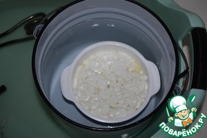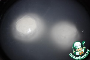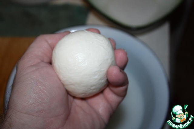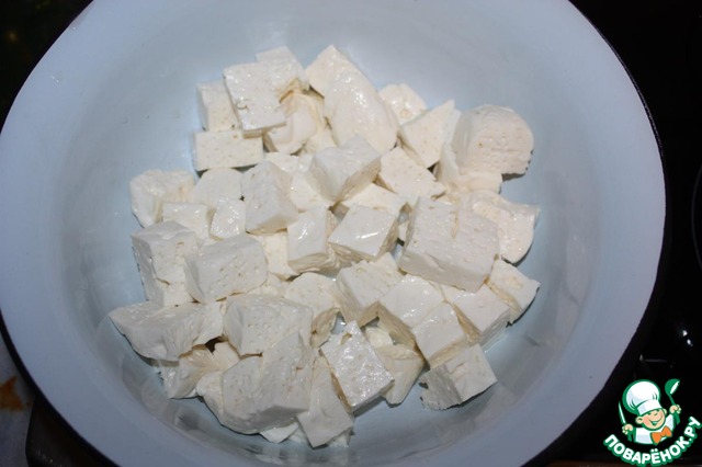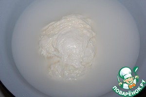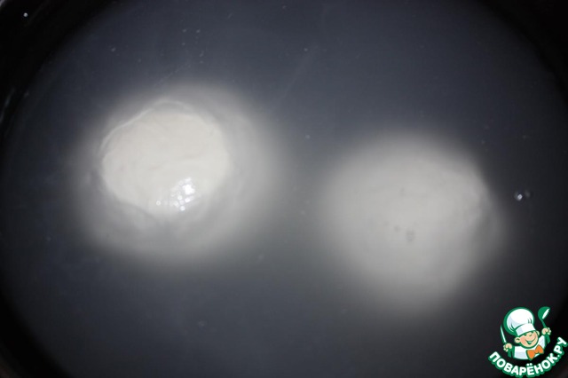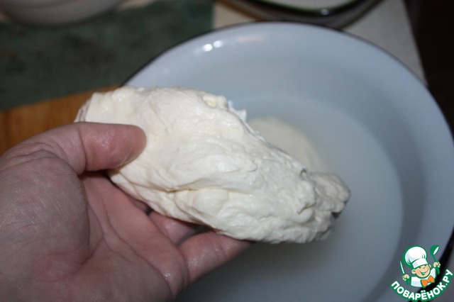 Залейте горячей водой температурой примерно 75 градусов. Дальше, если Вы не можете терпеть воду такой температуры, наденьте двое перчаток. Начинайте мять сырную массу и слеплять в комок, пока не получится сырное тесто.
