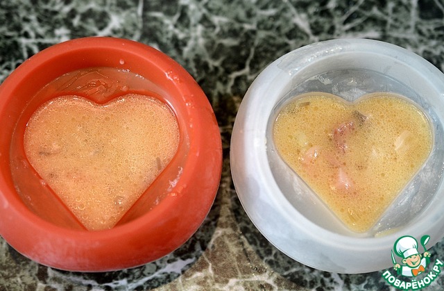 Вылить полученную массу в формочки. Готовить на водяной бане около 30 минут. Или в микроволновке около 5 минут. Или в духовке до готовности.
