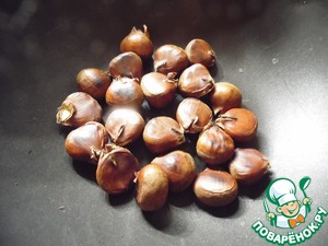 Каштаны обжарить на сухой сковородке, сделав крестообразные надрезы, остудить (примерно 30 минут, периодически встряхивая сковородку). каштаны остудить, почистить.