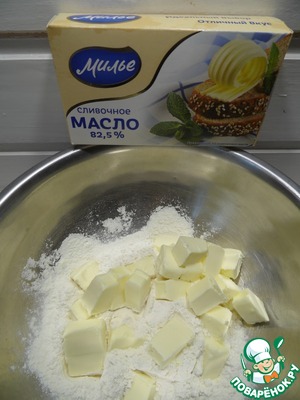 Сливочное масло "Милье" (холодное) нарезать небольшими кубиками, растереть с мукой и солью в крошку.