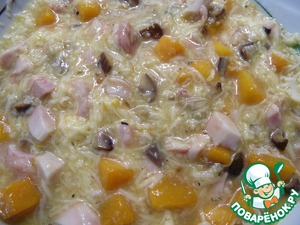 Яйца взбить с солью и перцем, смешать с натертым на средней терке сыром. Полученную смесь соединить с курино-тыквенно-кашт ановой массой, все хорошо перемешать.