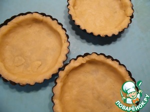 Формы для тартов (у меня 6 штук диаметром по 9 см.) смазать сливочным маслом, выложить в них тесто, сделав бортики.
