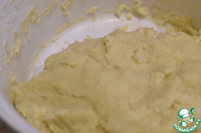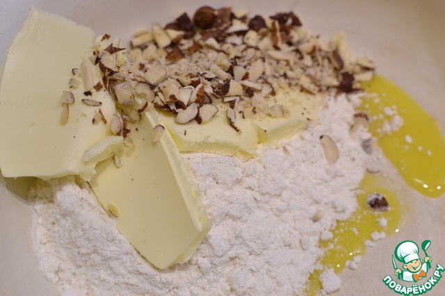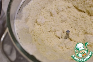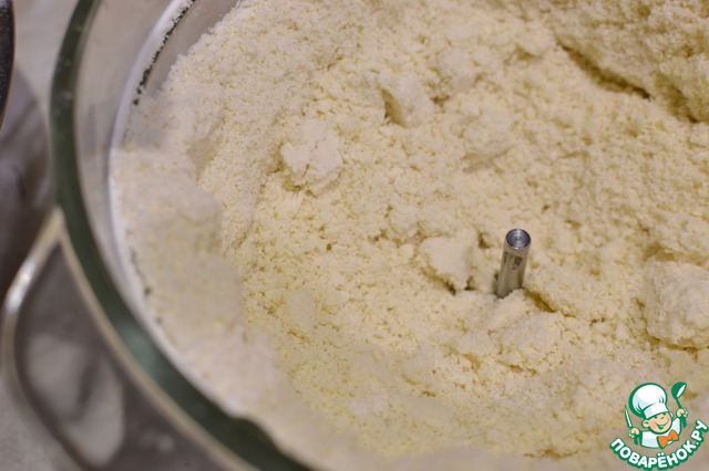 Из масла и муки, предварительно смешанной с разрыхлителем, любым привычным способом делаем крошку (я делаю это в измельчителе).