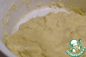 Яичную смесь соединяем с крошкой, замешиваем тесто, оно остается достаточно липким, по возможности скатываем в шар, убираем в холодильник на 1час.