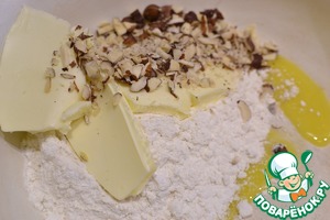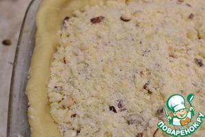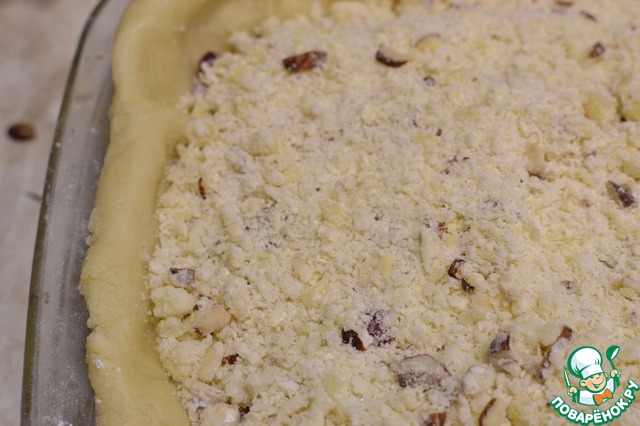 Разогреваем духовку до 200 град. Из ингредиентов для посыпки делаем крошку ножом.