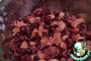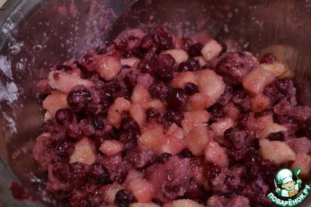 Яблоко чистим от шкурки и семечек, режем на мелкие кубики. смешиваем с ягодой, добавляем сахар, крахмал, перемешиваем.
