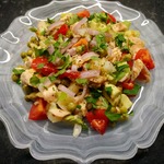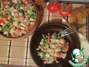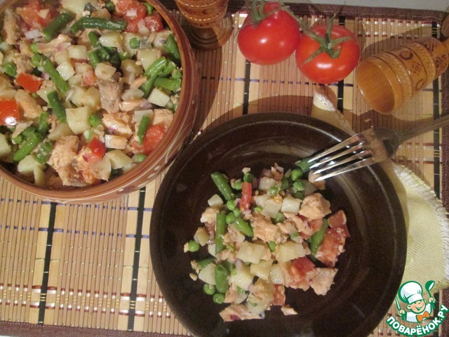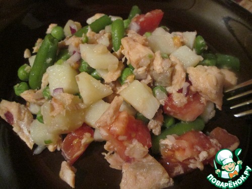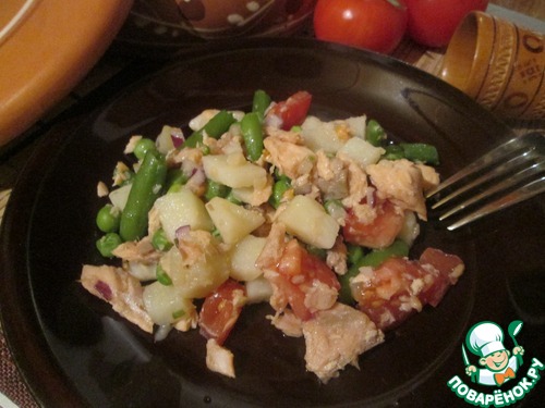 Вкусный салат, сытный без отягощения. Рыбу для него я готовила по рецепту Людочки ( beautiful woman ), за который ей очень благодарна. Очень хорош для ужина. Рецепт из журнала " Кушать подано ".