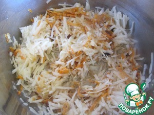 Картофель моем, чистим, трем на крупной терке и добавляем в кастрюлю. Готовим еще 5 минут.