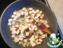 Лук немного обжарился, добавляем багет или батон, порезанный небольшими кубиками, и обжариваем минут 5 на небольшом огне.