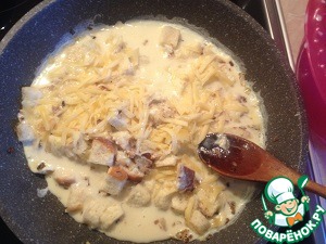 Пока лук с багетом обжариваются, в миске смешиваем яйца, молоко и сливки. И выливаем смесь на сковороду. Посыпаем сверху тертым сыром. Перемешиваем. Накрываем крышкой. Жарим минут 5. Затем еще раз перемешиваем. Опять накрываем крышкой и обжариваем, пока яйца не зарумянятся.