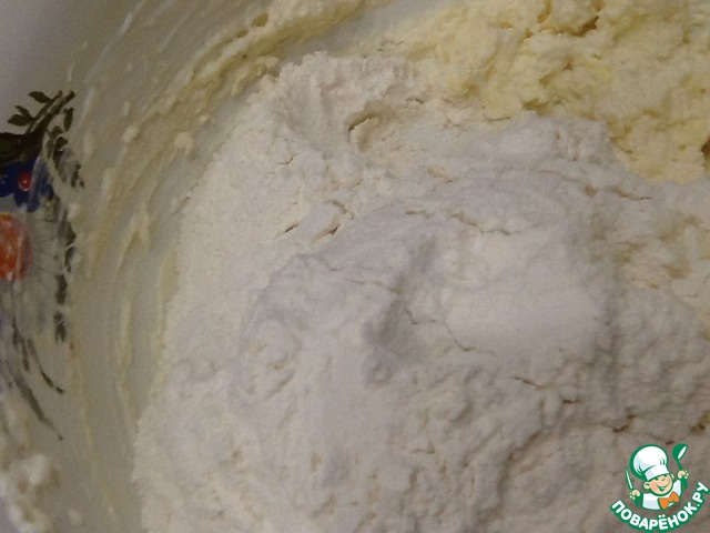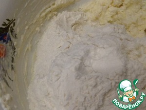 Муку смешиваем с содой и солью и потихоньку добавляем в нашу масляно-сметанную смесь.