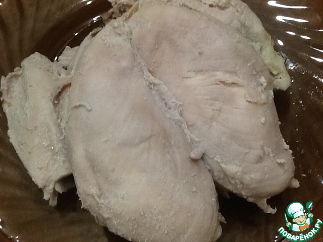 Курочку я отварила заранее. У меня грудка в этот раз, но если вы возьмете всю курочку и используете разное мясо - будет сочнее!