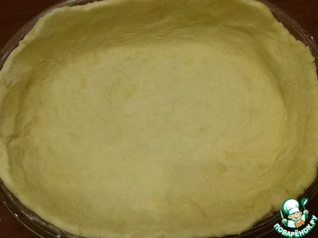 Собираем наш курник. Тесто делим на бОльшую и меньшую части. Большую раскатываем и переносит в форму для выпечки. Размер раскатанного пласта должен быть таким, чтоб закрыть дно и сформировать бортики пирога.