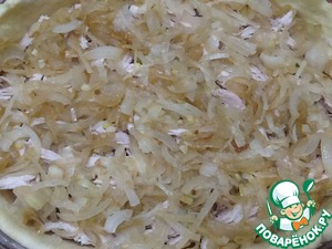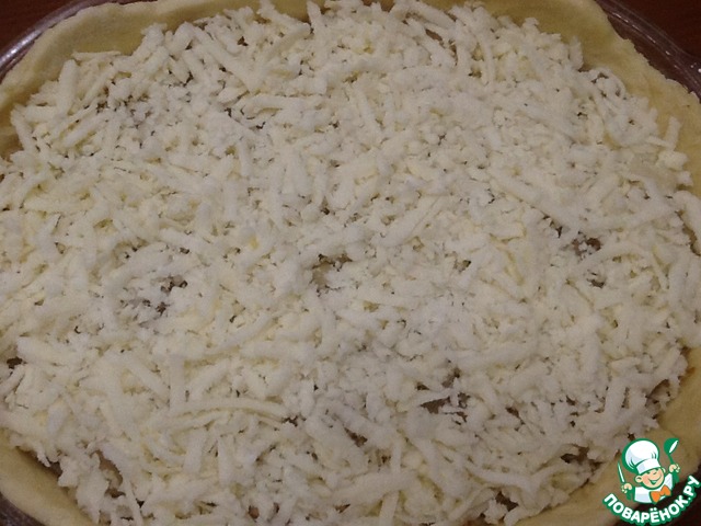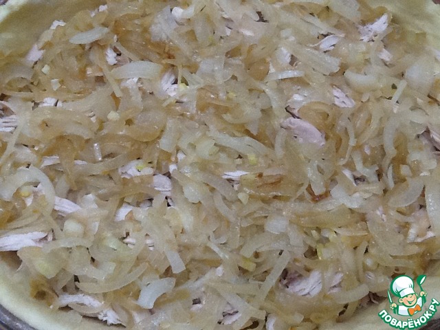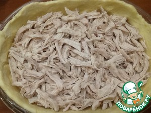 Слоями выкладываем начинку. Сначала разобранную на волокна курочку.