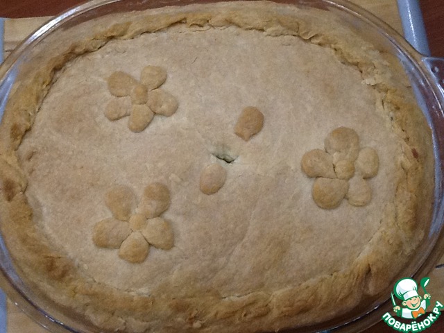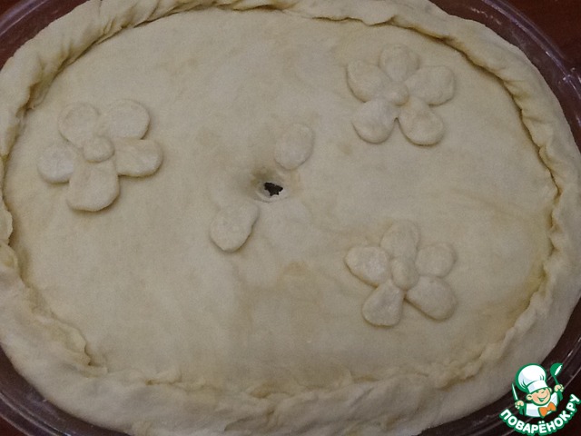 Раскатываем меньший кусочек теста и накрываем нашу начинку. В середине делаем дырочку для выхода воздуха. При желании украшаем цветочками или другими узорами.