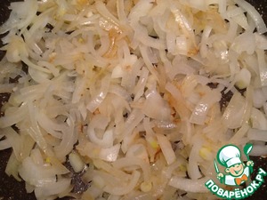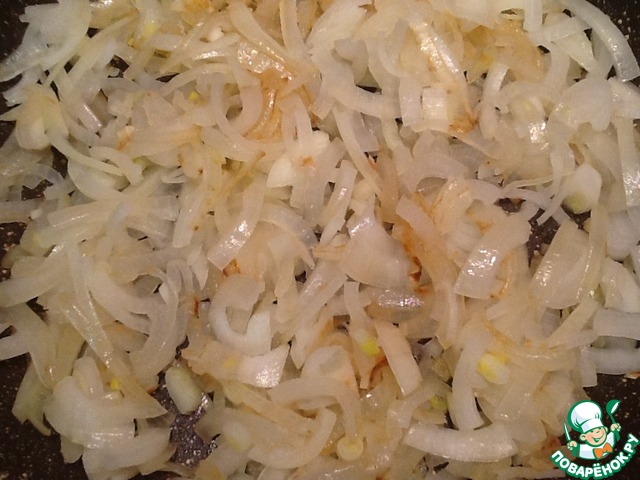 Лук порезать четверть кольцами и слегка поджарить на небольшом количестве подсолнечного масла.