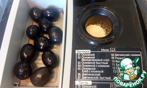 Маслины и дрожжи кладем в диспенсеры. Маслины кладем целыми, они в процессе замеса измельчатся. Если у Вас нет диспенсера, то добавляем маслины во время замеса.